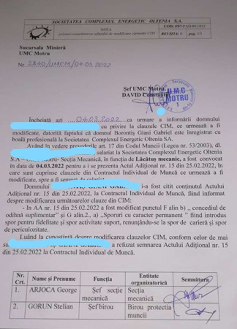 În urma nor decizii luate de conducerea CE Oltenia, salariații înregistrați cu boli profesionale vor fi mutați, scriptic, pe alte posturi, nu vor mai beneficia de grupa specială și nici de anumite sporuri.
