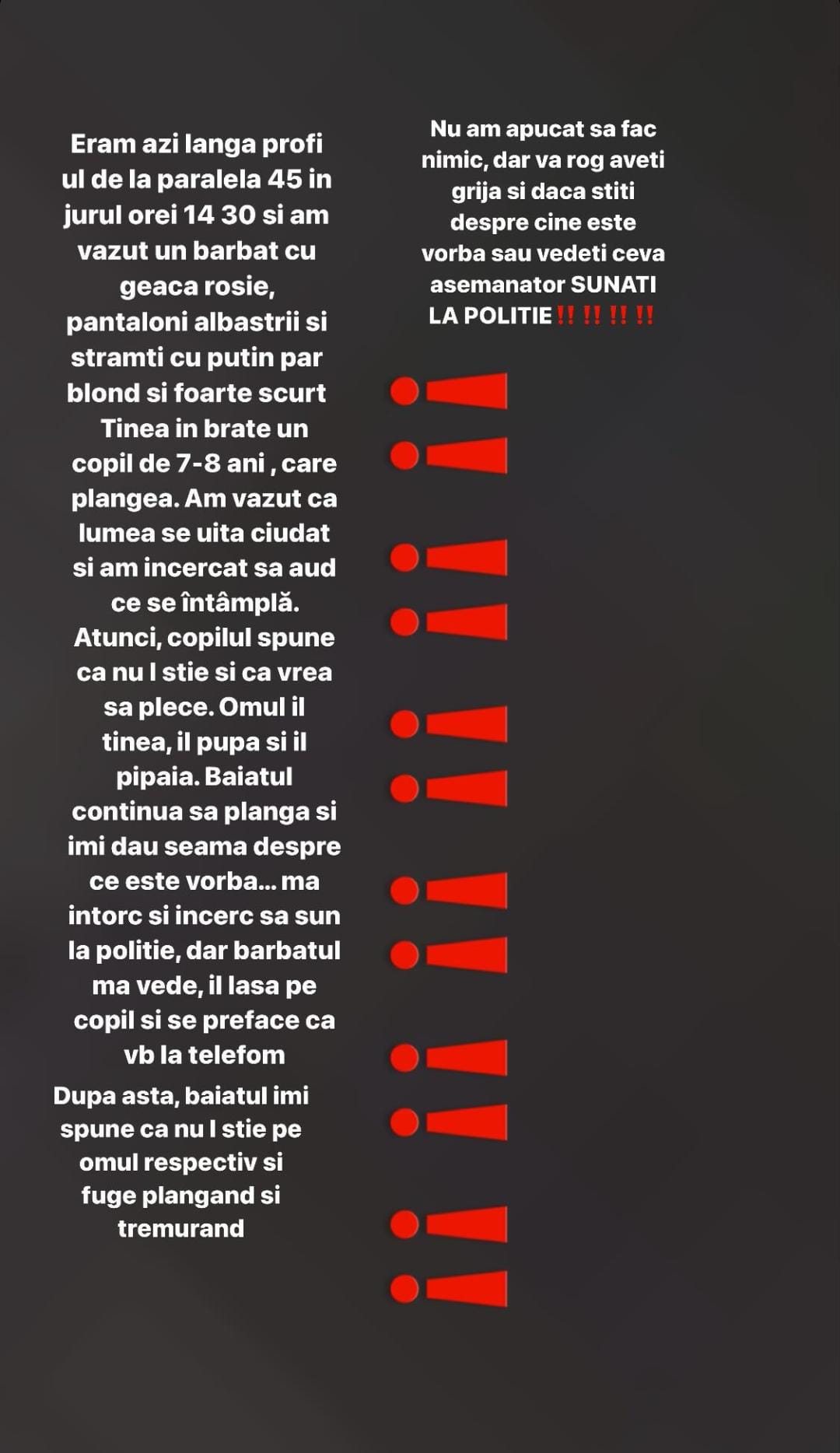 Un mesaj alarmant circulă pe conturile de Instagram ale tinerilor din Târgu Jiu. Unul dintre adolescenți a povestit cum a văzut un bărbat cu geacă roșie, pantaloni albastri și strâmți, păr blond scurt, care ținea în brațe un copil de 7-8 ani care plângea. Tânărul a observat că lumea se uita ciudat la persoana în cauză și s-a apropiat, auzind că băiatul spunea că nu-l știe în timp ce ”omul îl ținea, pupa și pipăia”.