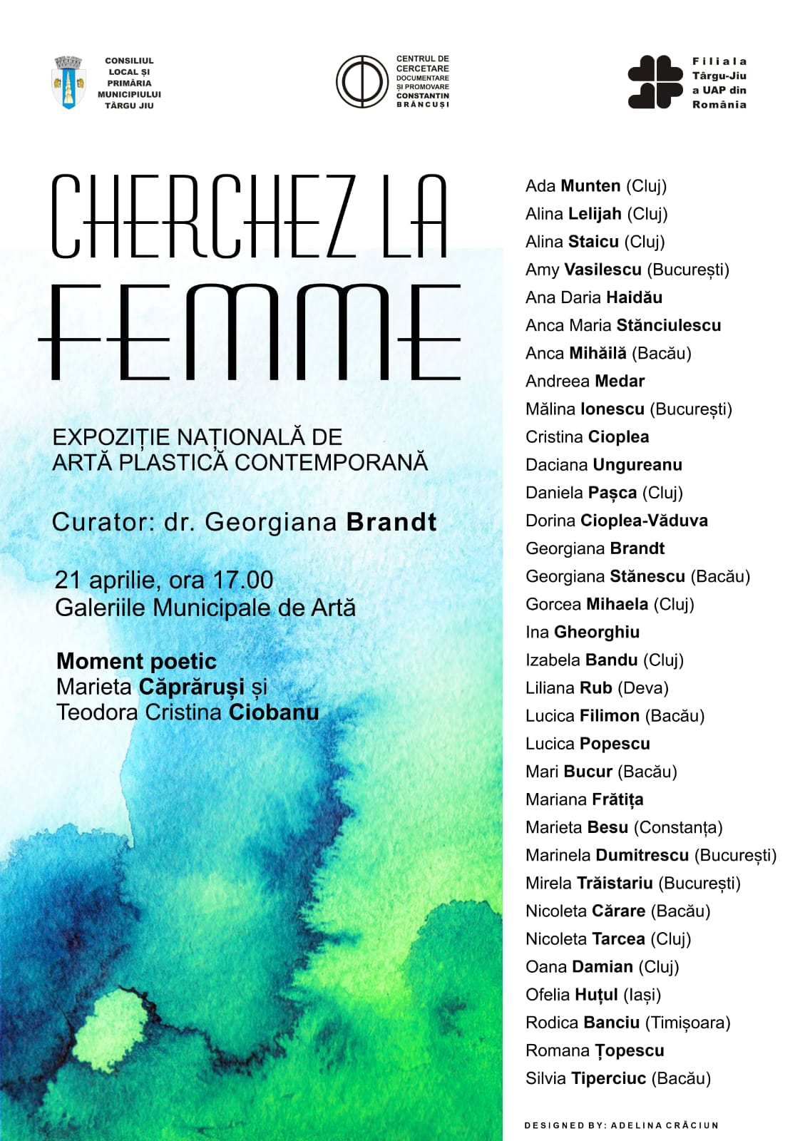Filiala Târgu Jiu a UAP din România, în parteneriat cu Centrul de Cercetare Documentare și Promovare ,,Constantin Brâncuşi” și Primăria Municipiului Târgu Jiu, organizează în data de 21 aprilie 2022, ora 17.00, la Galeriile Municipale de Artă din Târgu Jiu (Galeriile de Artă ,,Constantin Brâncuși”), vernisajul Expoziției Naționale de Arte Vizuale ,,Cherchez la femme”.