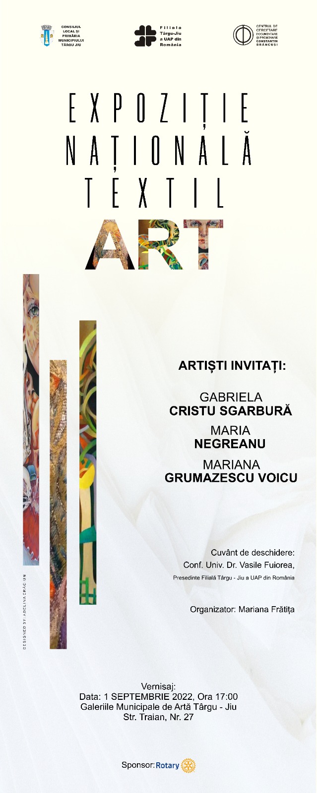 Filiala Târgu Jiu a Uniunii Artiștilor Plastici din România, în parteneriat cu Centrul de Cercetare Documentare și Promovare ,,Constantin Brâncuşi” și Primăria Municipiului Târgu Jiu, organizează în data de 1 septembrie, ora 17.00, la Galeriile de Artă ,,Constantin Brâncuși” din Târgu Jiu, vernisajul expoziției naționale de Arte Vizuale ,,TEXTIL ART”.