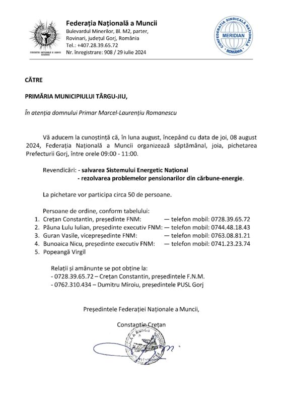 Federația Națională a Muncii anunță că reia pichetarea Prefecturii Gorj, în luna august, în fiecare joi, timp de două ore. În prezent, este singura organizație care se opune planului de închidere a capacităților pe cărbune.