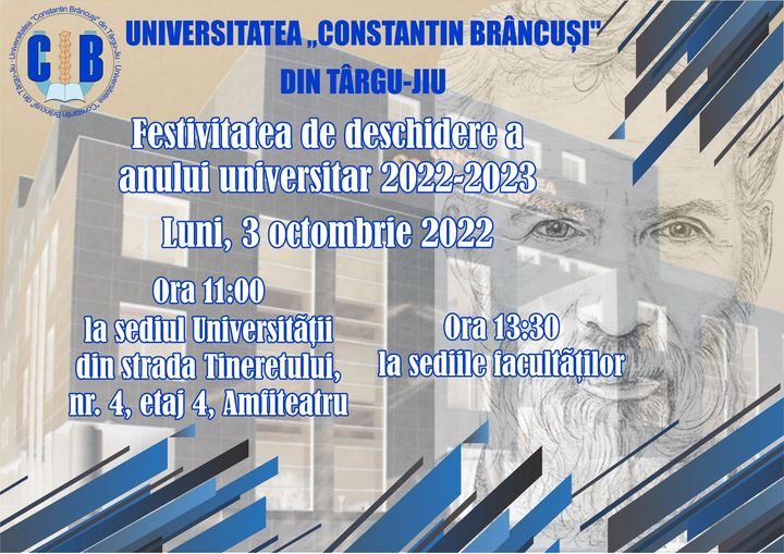 Festivitățile de deschidere a noului an academic la Universitatea „Constantin Brâncuşi” din Târgu-Jiu se vor desfășura în data de 03 octombrie 2022, începând cu ora 1100, conform următorului program: