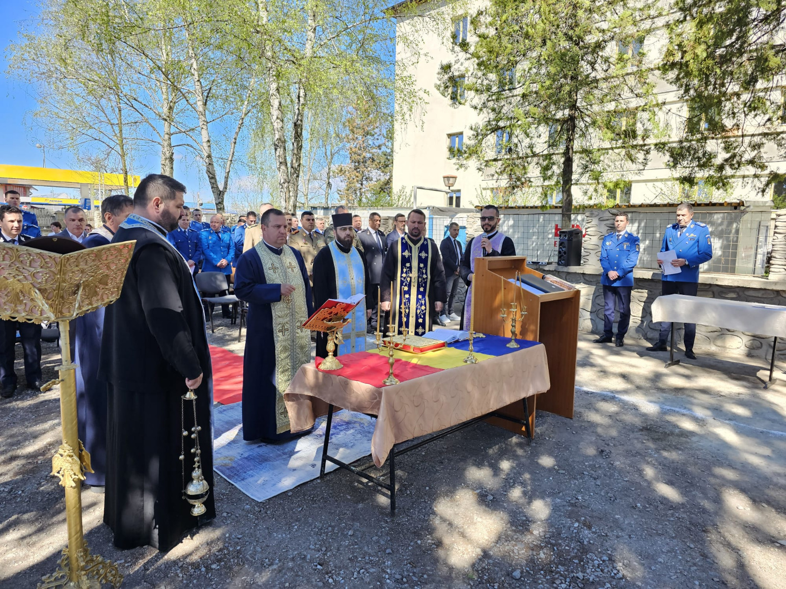 Totodată, a avut loc și oficierea slujbei religioase cu prilejul sfințirii pietrei de temelie pentru biserica inspectoratului.