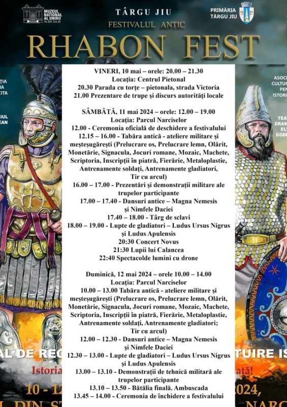 Sâmbătă, între orele 12:00-19:00, și duminică, între orele 10:00-14:00, tabăra antică vă așteaptă în Parcul Narciselor din Târgu Jiu cu ateliere interactive, dansuri antice, lupte de gladiatori, demonstrații militare și bătălii între daci și romani.
