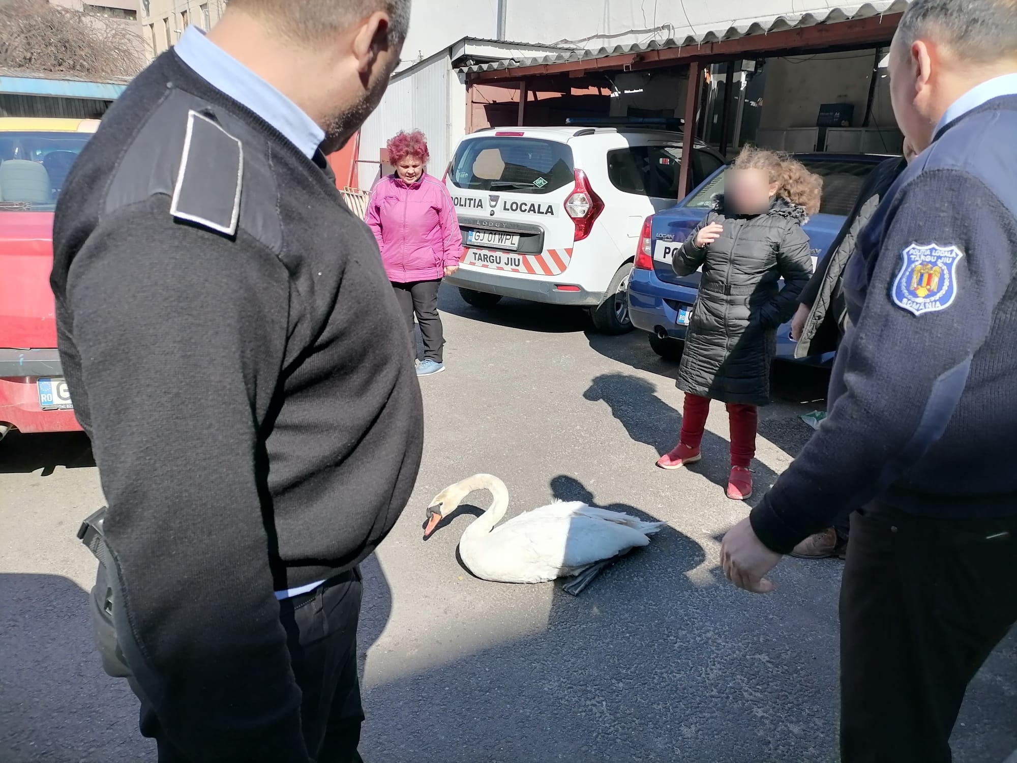 O familie de târgujieni a găsit o lebădă rănită pe strada Barajelor din municipiul Târgu Jiu și a adus-o la sediul Poliției Locale, cerând sprijin pentru salvarea ei.