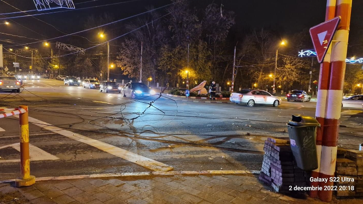 Firele de troleibuz și luminițele ornamentale au picat în zona giratoriului de la Piața Centrală din Târgu Jiu. ISU Gorj a comunicat că intervine în acest moment pentru a se asigura că nimeni nu e în pericol.