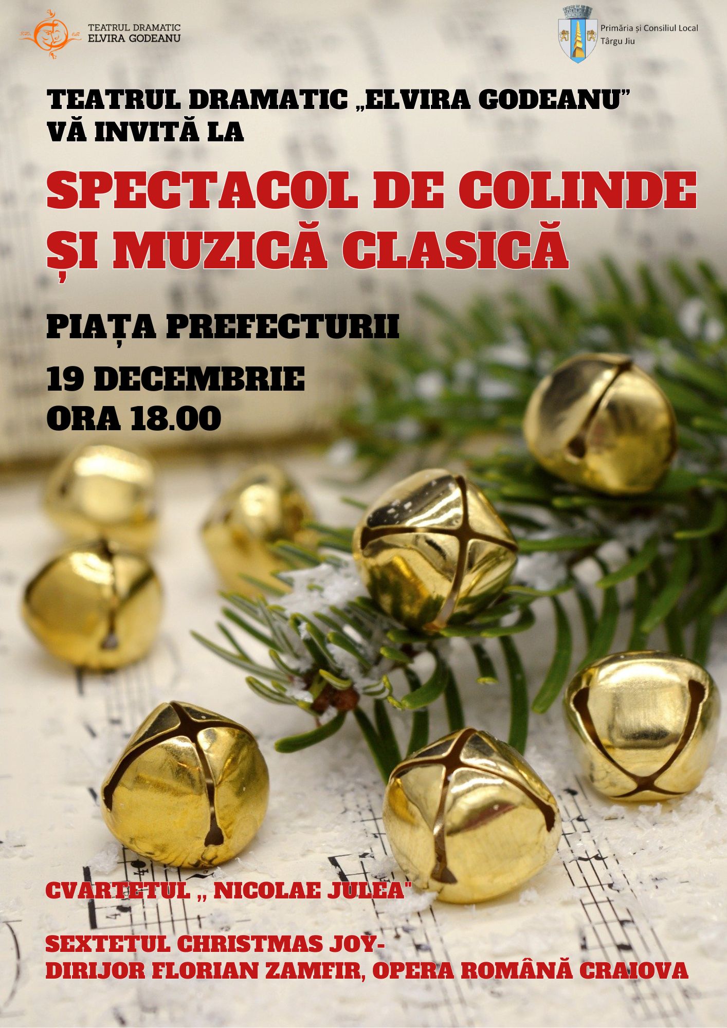 „Sărbătorile de iarnă se apropie, iar noi dorim să aducem o parte din magia lor mai aproape de dumneavoastră. Vă invităm așadar la un spectacol de colinde și muzică clasică, pe data de 19 decembrie, la ora 18.00, în Piața Prefecturii. Vor urca pe scenă: Cvartetul „Nicolae Julea”, Sextetul Christmas Joy – dirijor Florian Zamfir, Opera Română Craiova.