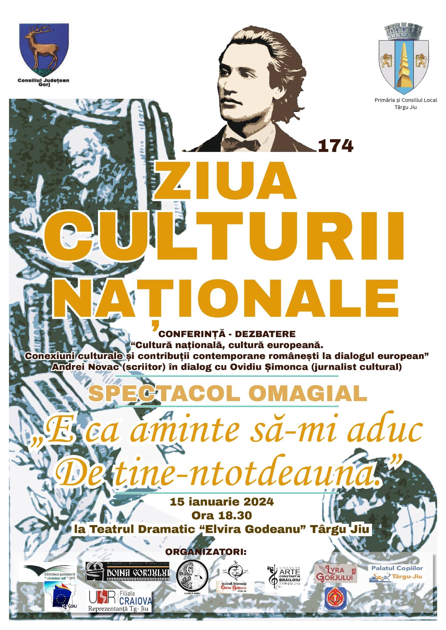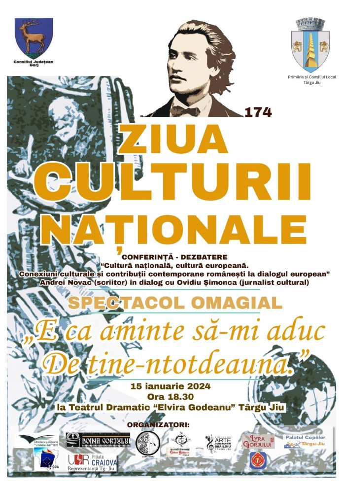 „Stimați prieteni ai teatrului, cu bucurie și onoare, vă invităm să vă alăturați nouă într-o zi deosebită de celebrare a culturii noastre naționale. Pe 15 ianuarie, sărbătorim nu doar aniversarea marelui nostru poet, Mihai Eminescu, ci și Ziua Națională a Culturii, o ocazie de a ne uni în jurul valorilor care definesc bogăția spirituală a României. Într-un cadru plin de reverență, vom celebra această zi prin spectacolul omagial „E ca aminte să-mi aduc. De tine-ntotdeauna”. Intrarea se va face pe bază de invitații”, a anunțat Teatrul Dramatic „Elvira Godeanu” din Târgu Jiu.