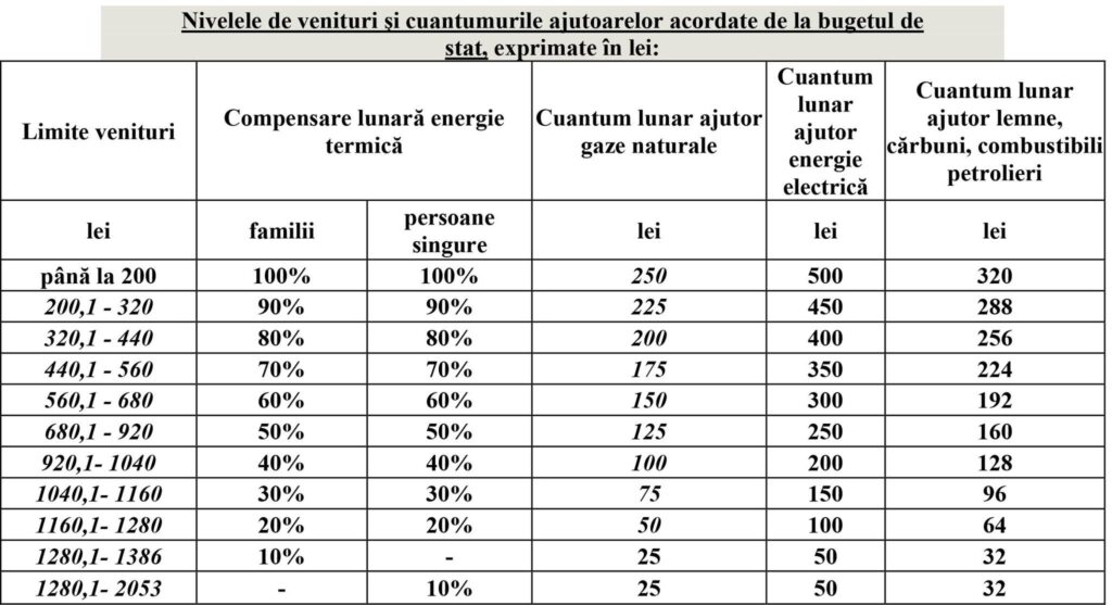 Venitul mediu net lunar până la care se acordă ajutorul pentru încălzirea locuinței și suplimentul pentru energie este de 1.386 lei/persoană, în cazul familiei, și de 2.053 lei, în cazul persoanei singure.