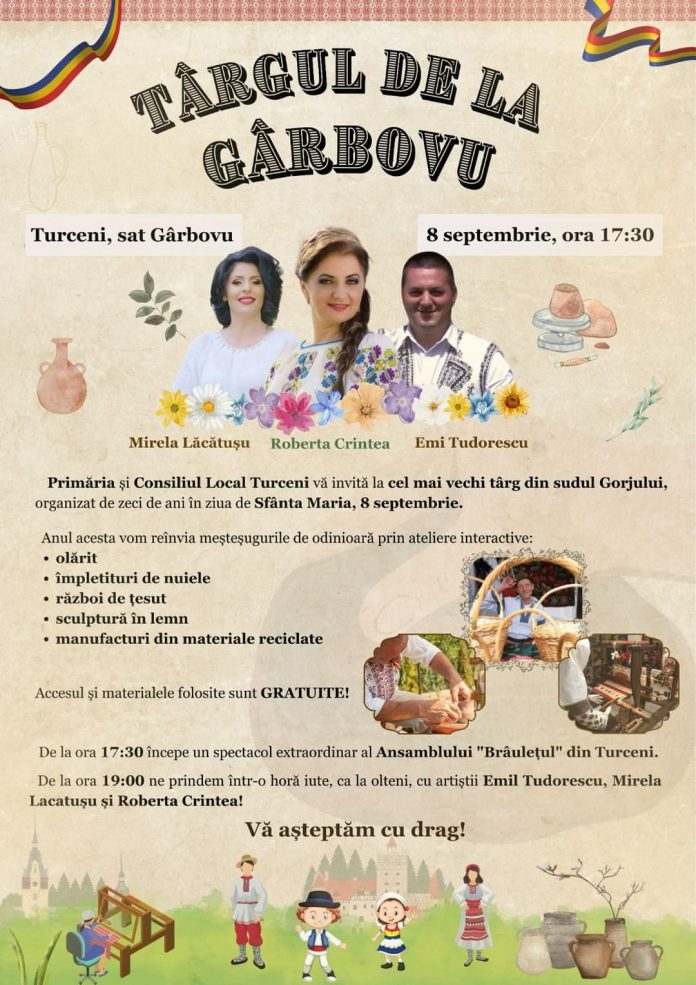 Vineri, 8 septembrie, de Sf. Maria Mică, Primăria și Consiliul Local al orașului Turceni organizează cel mai mai vechi târg din sudul Gorjului, și anume Târgul de la Gârbovu. Astfel, vineri, de la ora 17:30, cei prezenți vor putea participa la ateliere de meșteșugărit, urmând ca de la ora 19:00, pe scena ce va fi amplasată de către autorități, să urce următorii interpreți de muzică populară: Mirela Lăcătușu, Roberta Crintea și Emil Tudorescu.