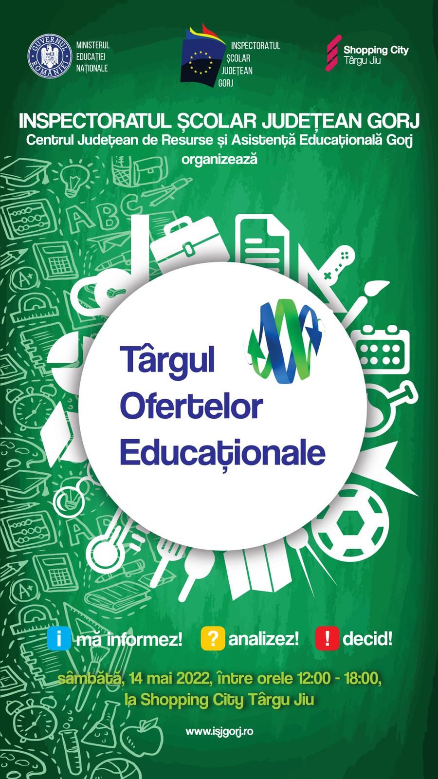 Sâmbătă, 14 mai 2022, între orele 12.00 – 18.00, în incinta Mall Shopping City Tg-Jiu, Inspectoratul Școlar Județean Gorj, alături de Centrul Județean de Resurse și Asistență Educațională Gorj, organizează Târgul Ofertelor Educaționale, ediția 2022.