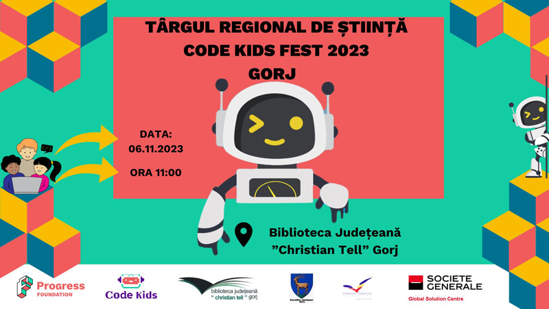 Biblioteca Județeană ”Christian Tell” Gorj găzduiește astăzi, de la ora 11:00, Târgul Regional de Știință CODE Kids FEST 2023. Evenimentul se desfășoară în cadrul proiectului ”CODE Kids – Programează viitorul comunității tale”. Participanții vor fi membrii cluburilor de coding: Cyber Power (Școala Gimnazială Ionești), The Makers Change (Școala Gimnazială Poiana), Crazy Coders (Liceul Tehnologic Turceni), Smart Kids Club (Biblioteca Orășenească ”Nicolae Diaconu” Țicleni) și Kids of Future (Biblioteca Comunală Vladimir). Invitați vor fi membrii Tea-Borgs, echipa de robotică a Colegiului Național ”Tudor Vladimirescu” Târgu Jiu. Parteneri locali ai evenimentului sunt Colegiul Național ”Tudor Vladimirescu” Târgu Jiu, Colegiul Național ”Spiru Haret” Târgu Jiu și Școala Gimnazială ”Constantin Săvoiu” Târgu Jiu. CODE Kids este o inițiativă națională de educație IT și STEM pentru copii, implementată de Fundația Progress, cu sprijinul financiar al Romanian American Foundation și Société Générale.