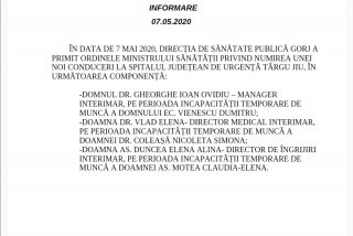 Numirile noilor trei șefi sunt făcute doar pe perioada incapacității temporare de muncă a vechii conduceri a Spitalului Județean de Urgență Târgu Jiu.