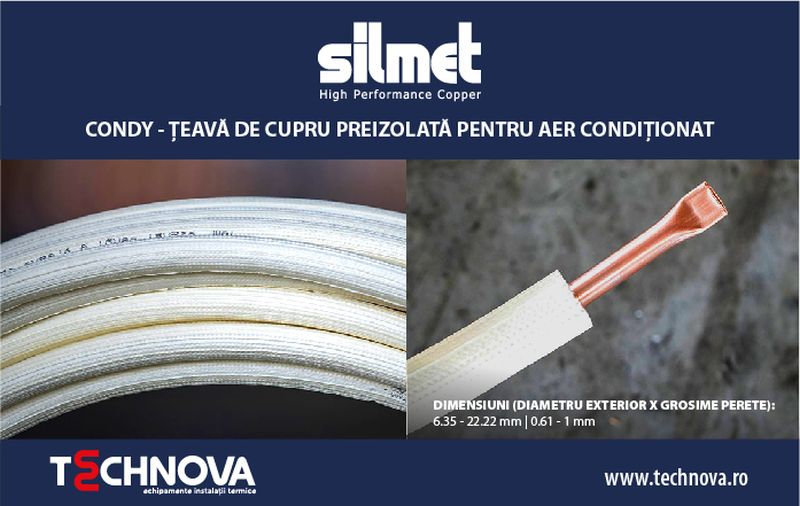 Technova este singurul importator al țevilor de cupru Silmet – Italia în România, această colaborare având obiectivul de a contribui activ la creșterea performanței în industria instalațiilor sanitare și nu numai. Prin parteneriatul Technova – Silmet se oferă soluții de încredere clienților din România și sunt satisfăcute nevoile și cerințele tot mai complexe la capitolul calitate și grijă față de mediu. Rezistența și durabilitatea sunt două criterii esențiale în selectarea materialelor și produselor pentru un proiect de instalații, țevile de cupru Silmet – Italia fiind dezvoltate în concordanță cu exigențele actuale și devenind opțiuni inteligente pentru instalația de aer condiționat, printre altele.