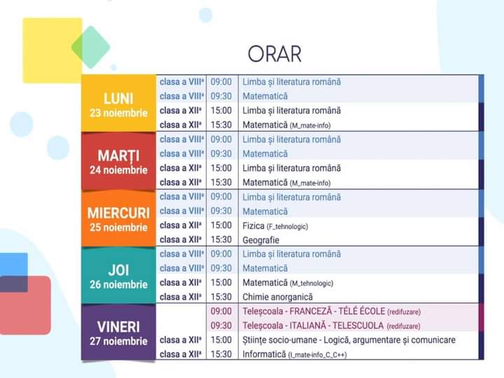 A fost anunțat orarul Teleșcoala pentru această săptămână. În perioada 23-27 noiembrie, elevii de clasa a VIII-a au în program lecții de Limba și literatura română și Matematică, de luni până joi, începând cu ora 09:00, respectiv 9:30, în timp ce în orarul elevilor de clasa a XII-a sunt trecute lecții de Limba și literatura română, Matematică, Fizică, Geografie, Chimie anorganică, Logică și Informatică; lecțiile destinate elevilor din ultimul an de liceu pot fi urmărite de la ora 15:00. Cursurile pot fi urmărite şi online – live – sau, ulterior, înregistrate, pe următoarele canale/platforme: TVR+ [https://www.tvrplus.ro/live/tvr-2], YouTube #TVR: https://bit.ly/3frF3KD, Telescoala TVR și tvr.ro [http://www.tvr.ro/telescoala.html]
