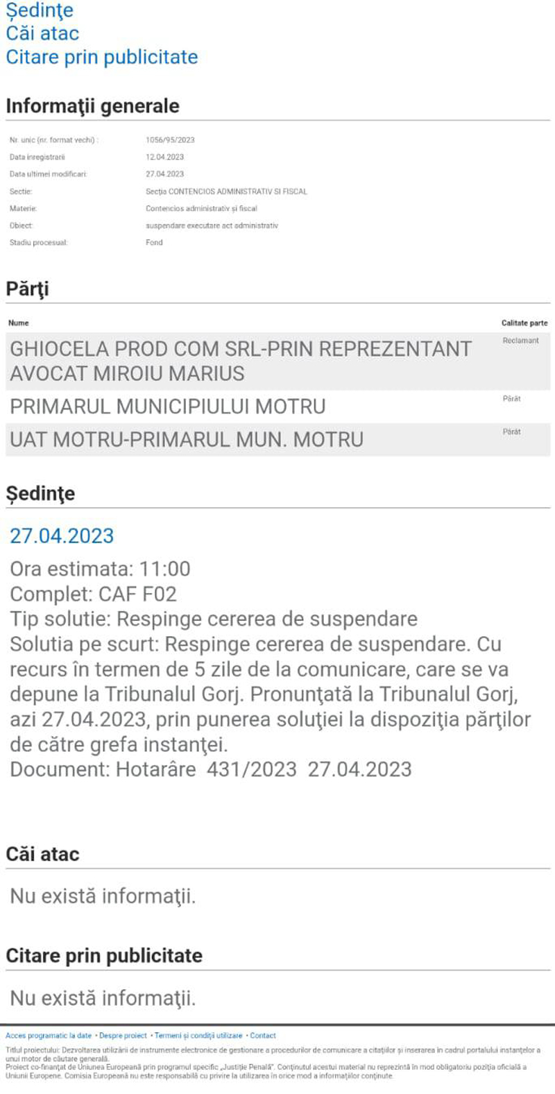 Poliția Locală Motru a adus la cunoștința tuturor instituțiilor de control ce se întâmplă la Motru, iar ANAF-ul și Antifrauda au răspuns, aducând la cunoștință că instituția publică are dreptul să confiște toate încasările pe perioada funcționării fără autorizație, să sancționeze contravențional societatea până la intrarea în legalitate. Chiar dacă firma se hotărăște să intre în legalitate, acest lucru nu este posibil repede deoarece societatea nu are cadastru, autorizație de construire pentru mai multe stații, construcții metalice, ba mai mult ea a realizat o platformă betonată de 50 mp, un gard de beton peste Canalul de gardă (matcă), ce aparține Consiliului Județean Gorj, și este administrat de autoritatea publică locală. Reamintim că acesta este certificatul de urbanism cu numărul zece, solicitat de firma ,,Ghiocela” primăriei, după ce a a fost prinsă în ilegalitate. Asta, pentru mai multe puncte de lucru, unde firma își desfășoară activitatea.