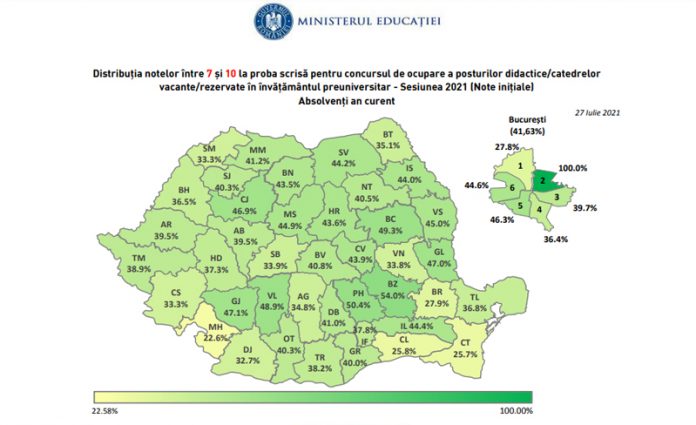 La nivel național, rata notelor peste 7 obținute de candidații care au susținut proba scrisă este de 44,47% (în scădere, față de rezultatele consemnate în ultimii patru ani: 58,66% în 2020, 46,86% în 2019, 47,40% în 2018, respectiv 45,73% în 2017). Procentul notelor între 5 și 7 este de 35,49%, în creștere comparativ cu anul trecut (27,23%). ,,Din promoția curentă, 40,63% dintre candidați au obținut note peste 7 (șapte) – (58,38% în 2020, 46,79% în 2019, 46,83% în 2018, respectiv 43,07% în 2017). 130 de candidați au obținut nota 10, iar 11.014 candidați au obținut note între 7 și 9,99. La proba scrisă din cadrul concursului național pentru ocuparea posturilor didactice din învățământul preuniversitar s-au prezentat 27.301 candidați din totalul de 34.120 de candidați înscriși. În centrele de evaluare au fost notate 25.059 de lucrări, întrucât: 2.193 de candidați s-au retras din concurs din motive personale sau medicale, în conformitate cu prevederile metodologiei, 8 candidați au fost eliminați, iar lucrările a 41 de candidați au fost anulate din motive legate de nerespectarea metodologiei. Candidații eliminați pentru fraudă sau tentativă de fraudă nu vor fi repartizați pe posturi didactice în anul școlar 2021-2022”, se arată într-un comunicat de presă al Ministerului Educației.