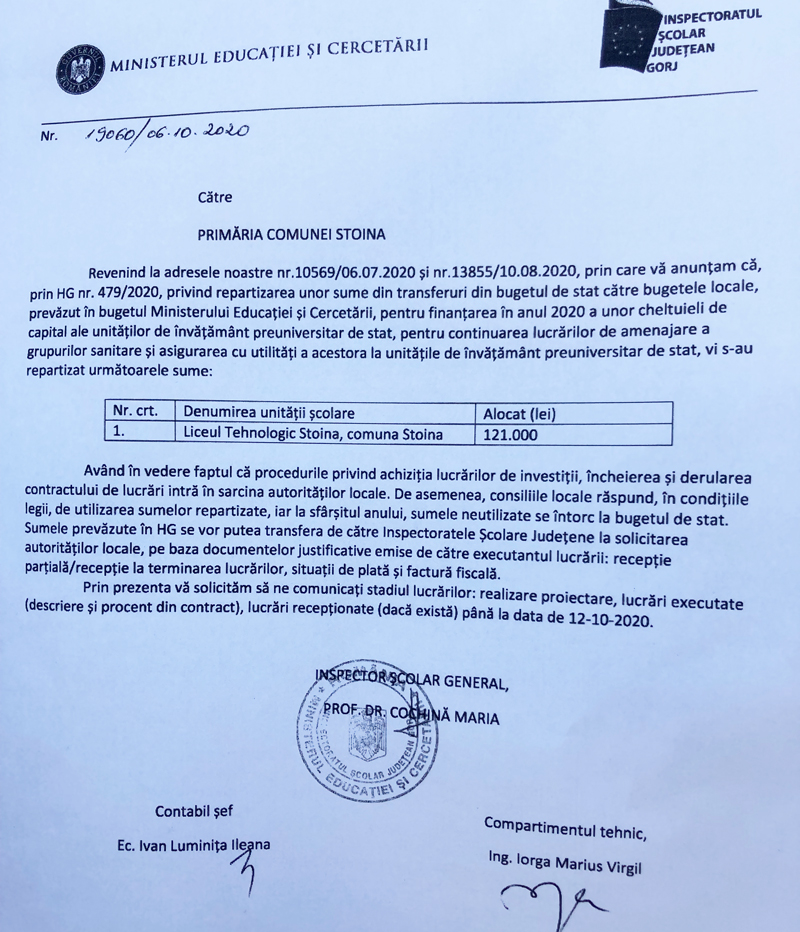 Elevii care învață la Liceul Tehnologic de la Stoina nu vor mai fi nevoiți din această toamnă să folosească tradiționala toaletă din fundul curții, existentă acolo de zeci de ani. Autoritățile promit că până la începerea noului an școlar vor fi finalizate lucrările de amenajare a unui grup sanitar modern, construit în această vară și care este parte componentă a clădirii în sine a școlii. Chiar dacă lucrările vor fi gata, nu se știe încă cine va plăti pentru ele întrucât primarul Laurențiu Anghel a descoperit că Ministerul Educației nu va mai finanța cota sa parte, așa cum anunțase anul trecut. În octombrie 2020, Inspectoratul Școlar Gorj informa Primăria Stoina că are alocată o sumă de bani, respectiv 121.000 de lei, pentru această investiție. Hârtia a ajuns la primărie cu câteva zile înainte de actualul primar să fie votat în funcție, el descoperind ulterior documentul. Pentru a nu rata șansa investiției, a demarat procedurile, deși studiul de fezabilitate a fost făcut în 2012 și de atunci autoritățile tot promit un astfel de proiect.