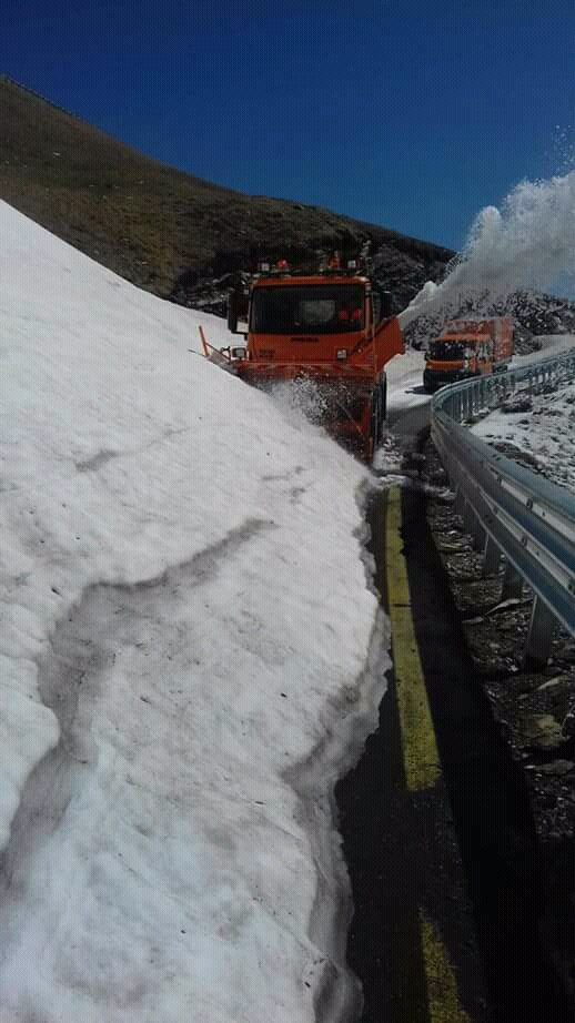 Mobilizare de forțe pentru deszăpezirea Transalpinei! Angajații Secției Drumuri Naționale Vâlcea au ajuns, ieri, cu autofreza la Vârful Cărbunele (2175 m). Pe de altă parte, drumarii gorjeni acționează dinspre Rânca spre Obârşia Lotrului.