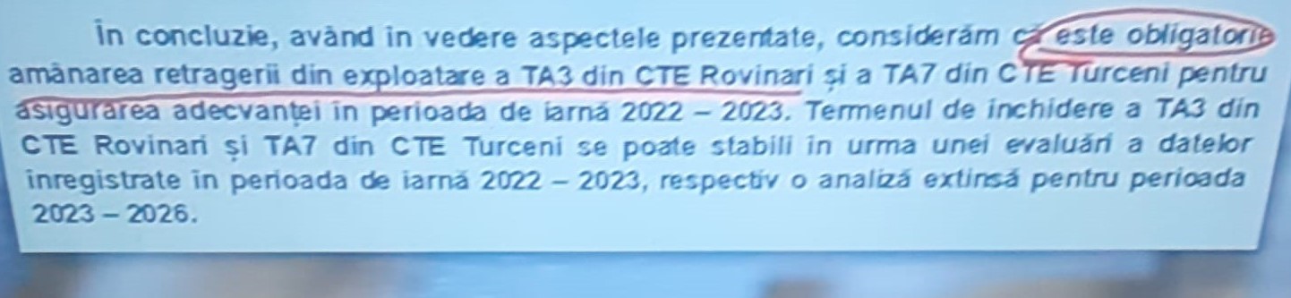 Este halucinant ca și în condițiile în care și Transelectrica a avertizat Ministerul Energiei, pe Virgil Popescu, că dacă renunțăm la cele două grupuri există riscul unui blackout în România, Virgil Popescu să le închidă! De la Bruxelles s-a întors și domnul prim-ministru fără să fi rezolvat problema, a rămas așa, cum a stabilit Popescu. Eu cred ca domnul prim-ministru este captiv intereselor lui Virgil Popescu, cel care și-a asumat în PNRR că scoate cei 660 MW ca să pună grupuri pe gaze. Nu vom reuși până în 2026, este practice imposibil. Nu putem tehnic să le facem, pentru că orice comandă de echipamente durează cel puțin patru ani.