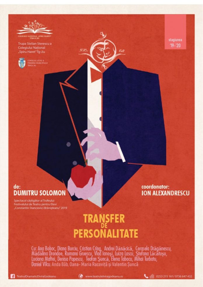 Sâmbătă, 29 februarie, de la ora 19.00, pe scena Teatrului Dramatic „Elvira Godeanu” din Târgu-Jiu, se va juca spectacolul „Transfer de personalitate”, câștigător al Trofeului Festivalului de Teatru pentru Elevi „Constantin Stanciovici-Brănișteanu” 2019. Distribuție: Josef Pavlicek – Vlad Ianoși; Comisarul – Andrei Dănăcică; Judecătorul – Teofan Șuncă; Judecătorul de instrucție – Daniel Vîlcu / Valentin Șuncă; Cetlicka – Cristian Crîng; Logodnica – Ana Boboc; Menajera – Luiza Lascu; Doctorul – Mihai Turbatu; Subcomisarul – Mădălina Drondoe; Polițistul 1 – Ramona Gruiescu; Polițistul 2 – Luciana Maftei; Iele – Diana Burciu, Cerasela Drăgănescu, Elena Tabacu, Oana Maria Racoviță, Anda Băb; Cerșetor – Denisa Popescu; Coordonator artistic – Ion Alexandrescu; Coordonator tehnic/lumini – Florin Rotaru; Sunet – Alexandru Palade; Sufleor – Anca Ularu.