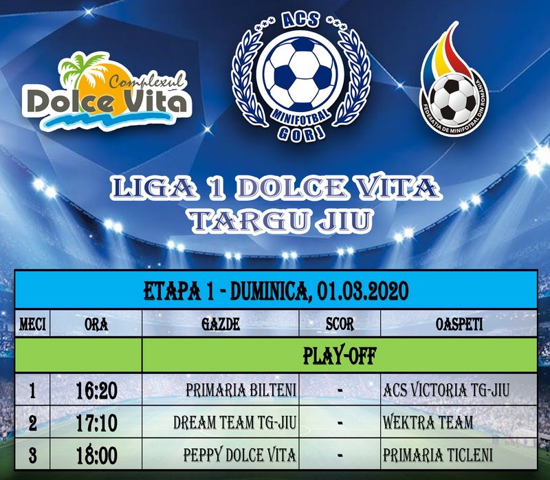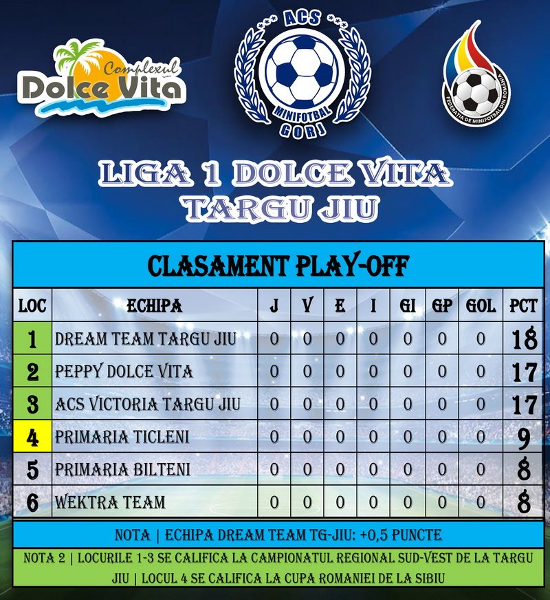 Dream Team pornește de pe primul loc, cu 18 puncte, iar Peppy Dolce Vita și ACS Victoria de pe următoarele locuri, ambele cu 17 puncte. Astfel, lupta la titlu va fi una extrem de palpitantă și care se va întinde, probabil, până la finalul sezonului cu numărul 14 la minifotbal în Complexul Dolce Vita.