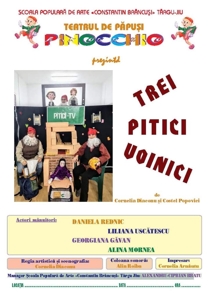 Copiii de toate vârstele sunt invitați duminică, 13 iunie, la ora 11:00, la spectacolul ”Trei pitici voinici”, ce va fi pus în scenă la Teatrul de Vară „Nelu Dumitru” Târgu Jiu. Regia artistică: Cornelia Diaconu. Text: Cornelia Diaconu. Distribuție: Alina Mornea, Adelina Popescu, Daniela Rednic, Georgiana Găvan și Liliana Uscătescu. Prețul unui bilet este de 7 lei!