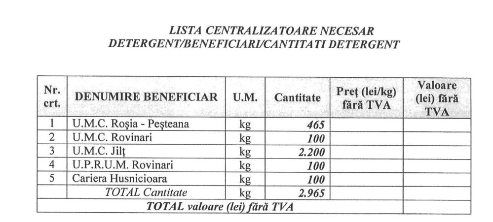 „Detergentul se folosește la spălarea/curățarea echipamentului salariaților, asigurarea igienei lucrătorilor participanți la procesele de muncă din sectoarele de extracție a cărbunelui, activități ce se desfășoară în condiții de contact a pielii cu praf, cărbune, uleiuri, în scopul prevenirii îmbolnăvirilor profesionale”, se arată în caietul de sarcini.