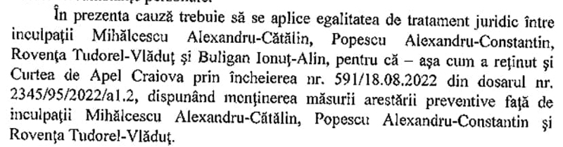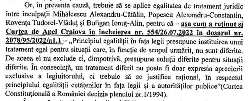 Instanța Tribunalului Gorj, punând în balanță egalitatea de tratament juridic între inculpații din dosarul ,,Dodoi”, a ,,admis cererea formulată de inculpatul Buligan Ionuţ-Alin.