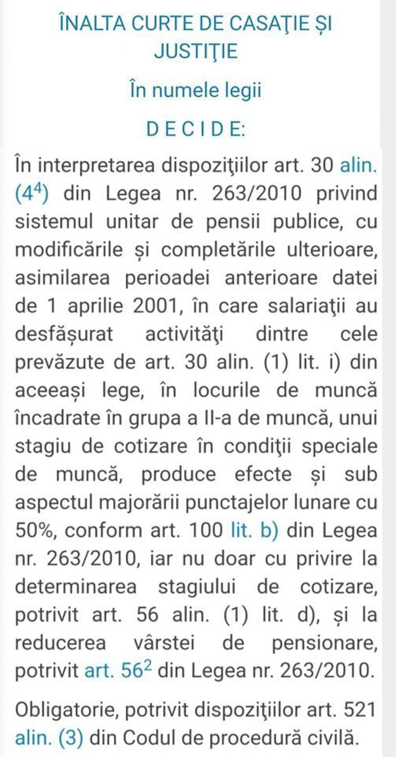 Vineri, 12 iulie 2024, a fost publicată în Monitorul Oficial DECIZIA I.C.C.J, din 3 iunie 2024, privind acordarea obligatorie și a punctajului de 50%, pentru perioada asimilată în condiții speciale de muncă, înainte de 2001, a anunțat vicepreședintele Sindicatului Energia Rovinari, Manu Tomescu.