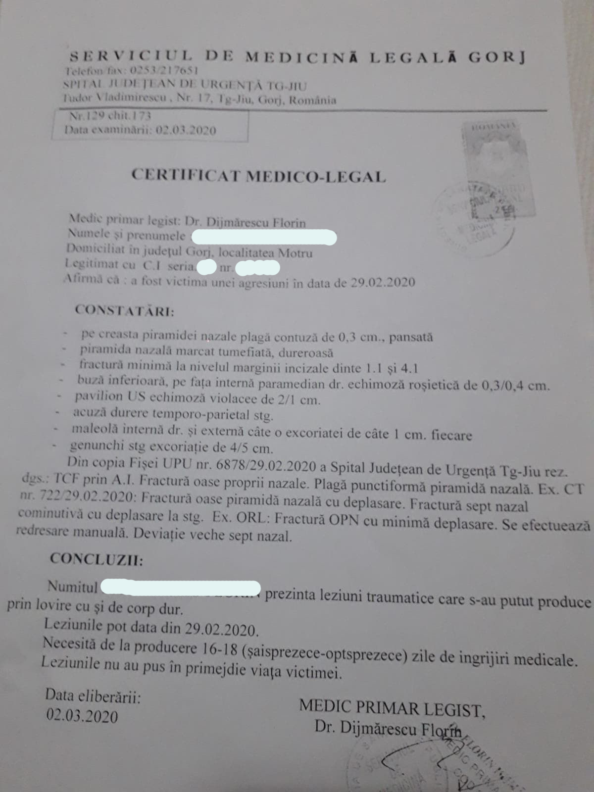,,Copilul meu a fost bătut în stradă, și luat în pumni de la complexul din zona de mijloc, adică de la Comis, pâna la supermarketul Ghiocela. A fost bătut pe stradă, în timp ce acesta vorbea la telefon. A primit 18 zile de îngrijiri, iar prietenul lui, agresat și el, a fost martor. A fost lovit puternic în zona feței, are dinți sparți și afectată piramida nazală. Băiatul meu a mai fost lovit cu 4 ani în urmă, de alții din aceeași gașcă, bănuiesc, că altfel nu văd de ce l-au întrebat dacă el a sifonat la Poliție”, a completat părintele.