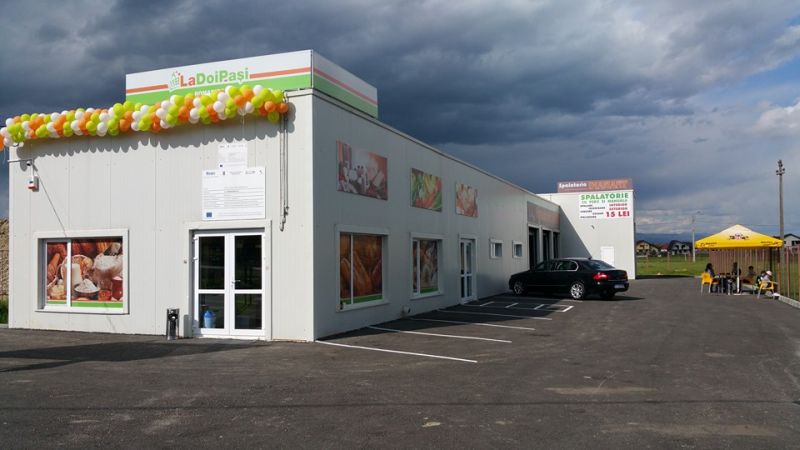 În clădirea ridicată cu fonduri europene, pentru spălarea mașinilor, Adrian Rotaru deschide pe 17 mai 2016 un magazin, pe franciza “La Doi Pași”. Spațiul comercial, realizat în clădirea pe care este postat anunțul privind proiectul cu fonduri europene, a fost inaugurat în campania electorală pentru alegerile locale, nepotul chemându-și unchiu, candidat la Primăria Târgu-Jiu, la inaugurare. Magazinul, fapt surprins în fotografiile de la eveniment, are rafturile doldora de produse, achiziționate de la diverși agenți economici care acceptă ca acestea să le fie plătite la un termen de una sau două luni. Patronul, ieșit din firmă în iunie, la o lună după inaugurare, se spală însă pe mâni de datorii, și nu plătește nimic, până în prezent, creditorilor.