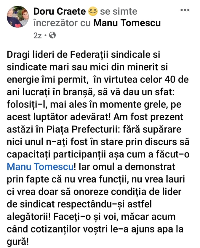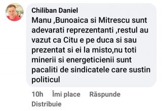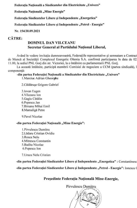 Lista cu reprezentanții minerilor și energeticienilor, făcută de nu se știe cine, trimisă lui Dan Vîlceanu, cuprinde numele liderilor de federații și organizații sindicale, care, nu numai că nu au protestat alături de Manu Tomescu, Nicu Bunoaica, Vasile Tivig și Lulu Păuna, timp de șase luni pentru legea pensionării anticipate, ci au ridiculizat protestele lor și chiar s-au opus cu vehemență legii 197/2021.