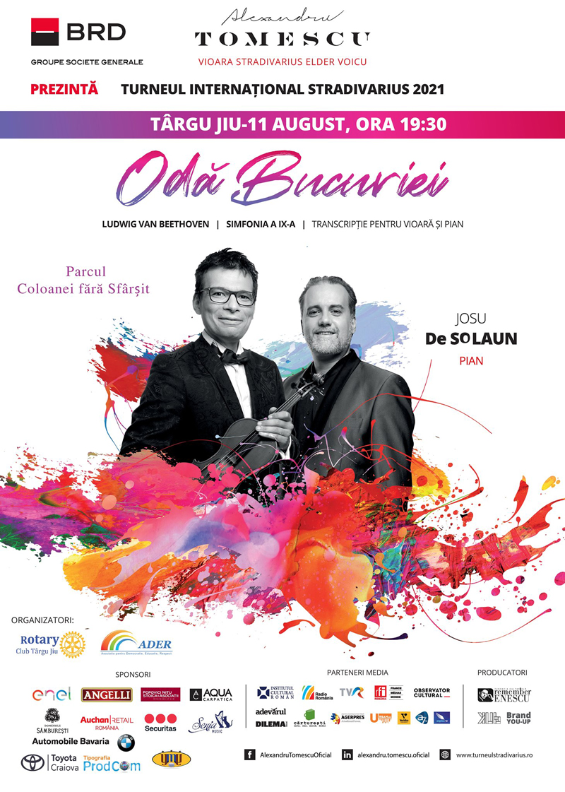 Clubul Rotary din Târgu-Jiu, împreună cu Asociația pentru Democrație Educație Respect, organizează luna viitoare, în data de 11 august 2021, ora 19.30, în Parcul Coloanei fără Sfârșit din Târgu-Jiu, Turneul Stradivarius 2021 – Odă Bucuriei.