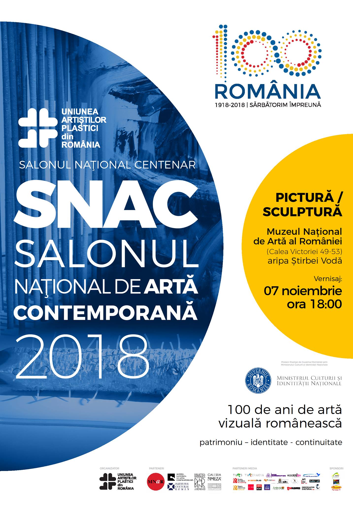 Salonul Național de Artă Contemporană (SNAC) – Centenar 2018 continuă tradiția istorică a saloanelor oficiale organizate în România începând cu anul 1864, sub diferite titulaturi – ca expoziții ale artiștilor în viață – urmărind să păstreze cu rigoare spiritul acestora, în direcția unei relevări cât mai fidele a preocupărilor actuale ale artiștilor români și a realizărilor lor artistice. „Dincolo de efortul recuperator şi de un anumit romantism al continuităţii, raţiunea profundă a actualului Salon Naţional de Artă Contemporană trebuie căutată nu doar în modelul interbelic, ci și în realitatea noastră imediată, în aspirațiile tacite ale artistului către o nouă percepție și, dacă se poate, către un nou statut. În plan nemijlocit, el se naşte ca o reacţie faţă de tendinţele centrifuge, de individualismul excesiv, de pericolul atomizării fenomenului şi, în acelaşi timp, faţă de riscul asocierii artiştilor în mici grupuri ideologico-pragmatice, uneori impenetrabile până la limita ezotericului. Cu alte cuvinte, Salonul Naţional este o pledoarie explicită pentru unitate și pentru diversitate, dar și o revoltă implicită a climatului artistic faţă de riscul proprie-i disoluţii din pricina bătăliei pe care artistul individual o duce zilnic pentru a supravieţui.”, susține Pavel Șușară – Curator general al Salonului Național de Artă Contemporană Uniunea Artiștilor Plastici din România mulțumește tuturor artiștilor înscriși pentru selecție, comisiei de jurizare și curatorilor care au asigurat selecția lucrărilor, corpului profesional care a făcut posibilă realizarea SNAC, partenerilor care au asigurat spațiile expoziționale și entităților care au sprijinit întregul efort de organizare cu generozitatea lor. Proiectul este finanțat de către Guvernul României prin Ministerul Culturii și Identității Naționale; Parteneri SNAC: Muzeul Național de Artă al României, Muzeul Național de Artă Contemporană, Biblioteca Națională a României, Institutul Cultural Român, Galeria Galateca. Parteneri media: Radio România Actualități, Radio România Cultural, Artindex, Modernism, Jurnalul Bucureștiului, Intell News, Observator Cultural, Senso TV, Contemporanii, ArtLine, Subversiv.info, Amos News, Manufacturat.ro, Art Safari Pavilionul de Artă București. Au sprijinit SNAC: Boromir, Tudor-Art, Betek, Varese, Focus Communication.