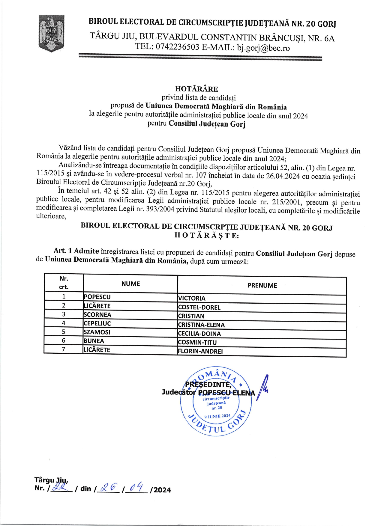 Biroul Electoral de Circumscripție Județean Gorj a admis, vineri, înregistrarea listei UDMR cu propuneri de candidați pentru Consiliul Județean Gorj.