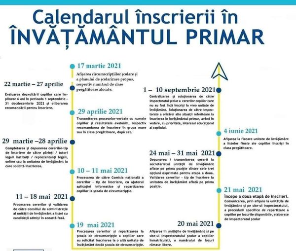 Potrivit calendarului înscrierii în învățământul primar, 28 aprilie este ultima zi a primei etape de completare și depunere/transmitere a cererilor-tip de înscriere de către părinți/tutori legal instituiți/reprezentanți legali. Cererile pot fi transmise online sau depuse la unitatea de învățământ la care aceștia solicită înscrierea copiilor. Completarea online a cererii de înscriere nu garantează însă înscrierea copilului în unitatea de învățământ și nu elimină obligativitatea părintelui de a se prezenta la unitatea de învățământ unde dorește înscrierea cu dosarul complet al copilului, în vederea validării cererii. În situația completării online a cererii de înscriere sau a transmiterii prin e-mail sau prin poștă, părintele va transmite unității de învățământ declarația-tip pe proprie răspundere, cu privire la veridicitatea informațiilor completate în cerere, respectiv recomandarea de înscriere în clasa pregătitoare, dacă este cazul. Validarea cererii-tip de înscriere este obligatorie și se face la unitatea de învățământ la care părintele solicită înscrierea sau prin intermediul mijloacelor electronice și constă în compararea datelor introduse în aplicația informatică cu documentele transmise de către părinte. În momentul completării cererii – tip de înscriere la unitatea de învățământ, sau, după caz, în momentul validării acesteia, părintele trebuie să depună recomandarea de înscriere în clasa pregătitoare, dacă este cazul, și o copie a actului de identitate propriu și o copie a certificatului de naștere al copilului, certificate conform cu originalul de către secretariatul unității de învățământ, pe baza documentelor originale. Cuprinderea copiilor în clasa pregătitoare se face în două etape succesive. Prima etapă se va desfășura în perioada 10-20 mai, după următorul calendar: 10-11 mai 2021 – procesarea de către comisia națională a cererilor-tip de înscriere, cu ajutorul aplicației informatice și repartizarea copiilor la școala de circumscripție; 11-18 mai 2021 – procesarea la nivelul unităților de învățământ, pe baza informațiilor din cererile-tip de înscriere și din documentele depuse/transmise de părinți/tutori legal instituiți/reprezentanți legali, a cererilor prin care se solicită înscrierea la o altă unitate de învățământ decât la școala de circumscripție, pe locurile rămase libere; 20 mai 2021 – afișarea în unitățile de învățământ și pe site-ul inspectoratului școlar a candidaților înmatriculați și a numărului de locuri rămase libere.