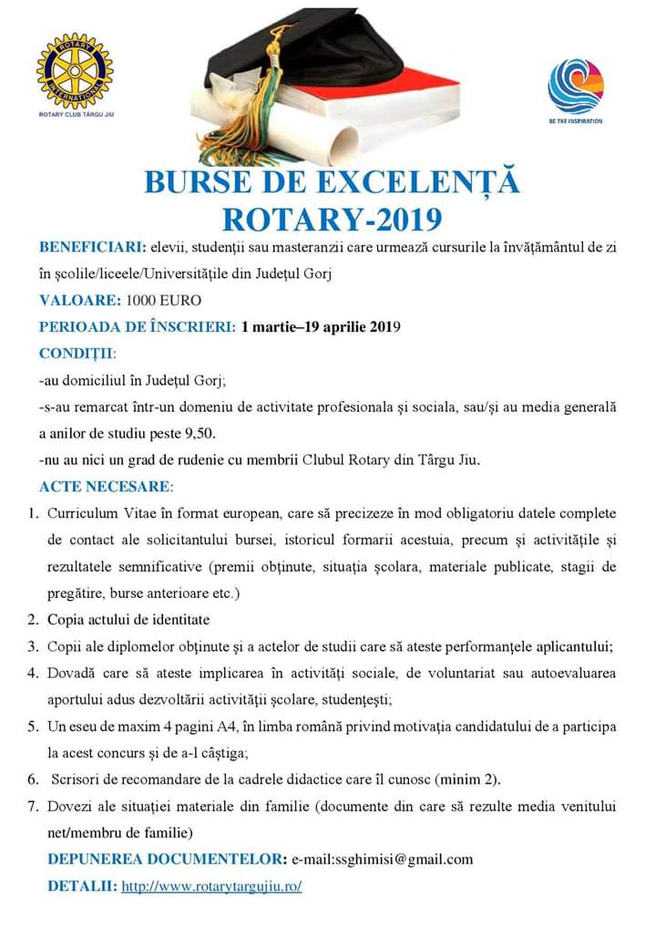 Doar astăzi, 1i9 aprilie 2019, se mai primesc dosare de candidatură pentru a obține una din cele 3 BURSE DE EXCELENȚĂ în valoare de 1000 de euro oferite de ROTARY CLUB TÂRGU JIU.
