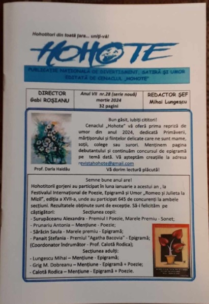 Marți, 5 martie 2024, într-o reuniune de suflet, Cenaclul a lansat revista „Hohote” cu numărul 28, serbând totodată colegele de cenaclu și partenerele de viață, într-un mod de-a dreptul feeric. Revista apare trimestrial și găzduiește, pe lângă creațiile membrilor cenaclului și creațiile unora dintre cei mai valoroși epigramiști ai momentului, din România și Republica Moldova. Revista pune pagini la dispoziția debutanților gorjeni în umor, care pot transmite creațiile email, pe adresa revistahohote@gmail.com.