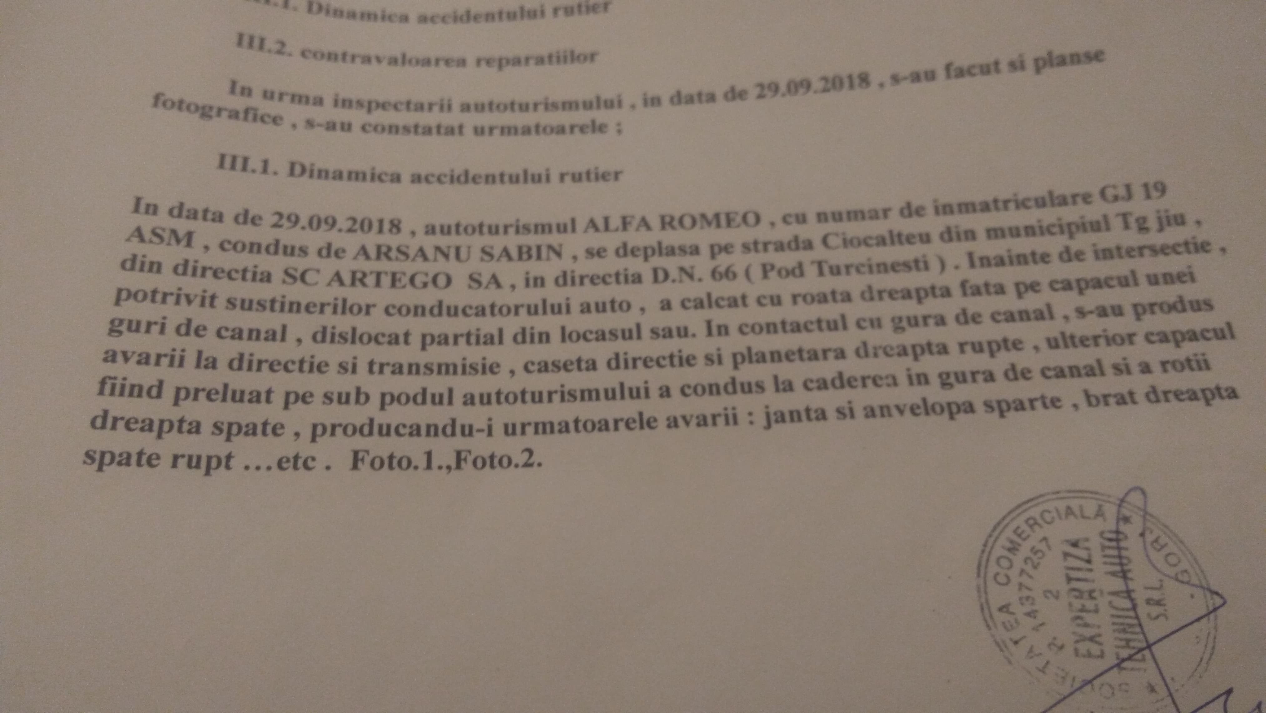 Sabin Arșanu în vârstă de 55 de ani, din Târgu-Jiu, a fost implicat pe 29 septembrie 2018 într-un eveniment rutier ciudat, care i-a produs o pagubă de 4700 de euro. Mai exact, în timp ce omul se deplasa pe strada Ciocârlău spre Artego-cap pod Turcinești, la volanul mașinii sale, o Alfa Romeo 166, a dat cu roata spate dreapta într-o gură de canal rămasă descoperită pe strada în cauză. Intrat cu roata în gaura căscată în asfalt, șoferul a tras de volan stânga, dar pentru că din față îi venea o mașină de mare tonaj, mai exact un TIR, a fost obligat să revină pe partea carosabilă. S-a oprit însă cu mașina într-un stâlp.