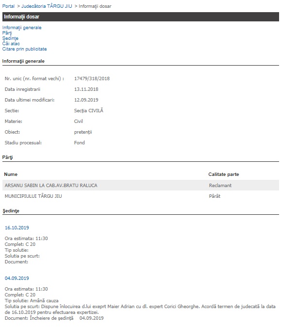 Litigiul lui Sabin Arșanu cu primăria se judecă la Judecătoria Târgu-Jiu din noiembrie 2018, pe 16 octombrie având un nou termen. În dosarul nr. 17479/318/2018 Primăria Târgu-Jiu ,,și-au asumat implicit vina”, a comunicat apărătorul lui Arșanu, la cererea Gorjeanul. ,,Îi avertizez pe participanții la trafic că incidentul în care am fost implicat poate să li se întâmple oricând și lor, asta deoarece în municipiu sunt mai multe guri de canal acoperite artizanal, care au înfipte în ele bețe în care sunt puse sticle de plastic pentru a avertiza șoferii să le ocolească.