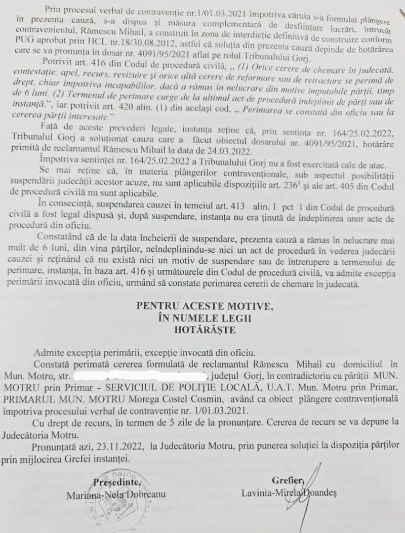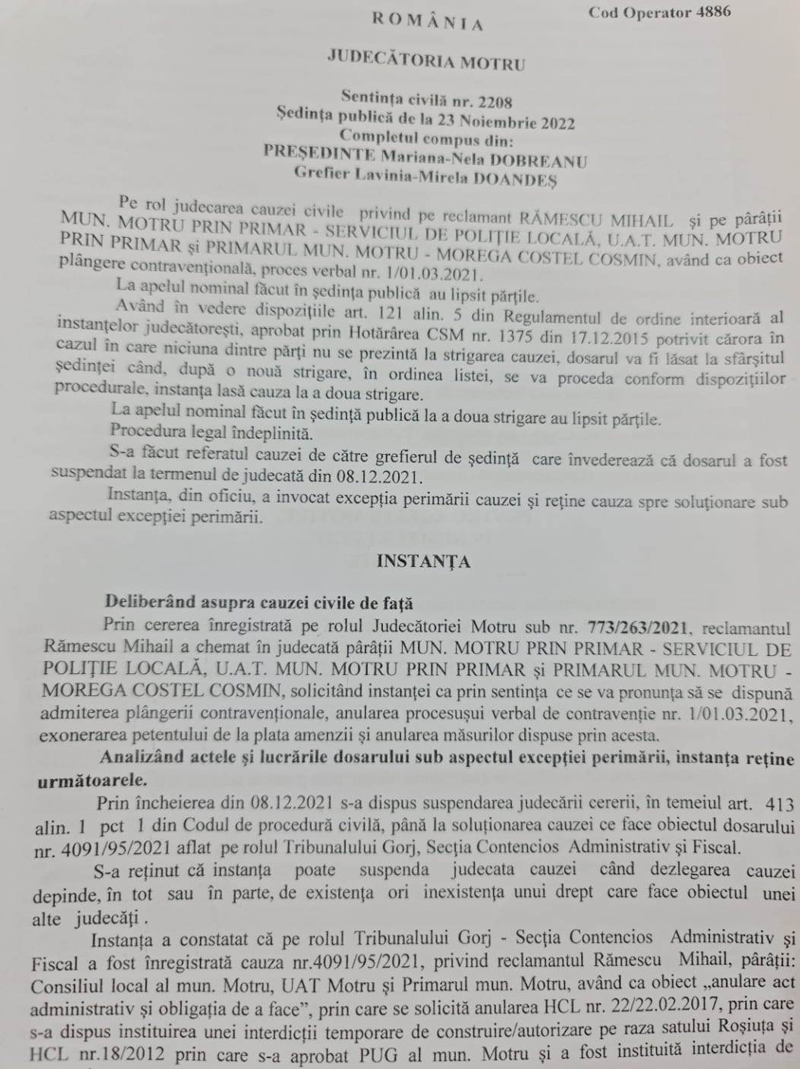 Potrivit hotărârii instanței, Rămescu va achita în sumă maximă, amenda de 10.000 de lei primăriei din Motru, deoarece nu a plătit, în termen, cei 5000 de lei, sumă stabilită drept sancțiune de autoritatea municipală, la momentul controlului.