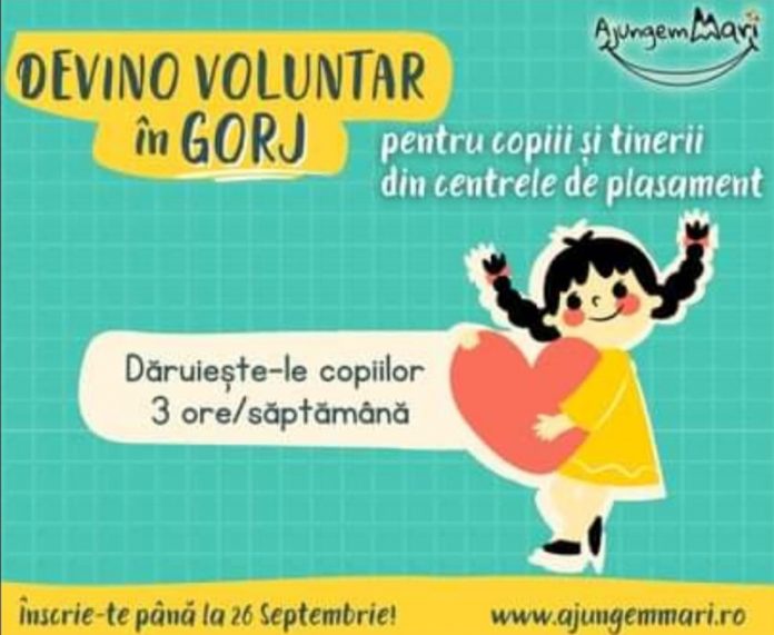 80 de copii din centrele de plasament și căsuțele de tip familial din Târgu-Jiu, Novaci, Tg. Cărbunești, Scoarța, Răchiți, Rovinari și Petrești așteaptă noi voluntari care să le dăruiască 3 ore pe săptămână, să îi învețe și încurajeze. ,,Căutăm voluntari serioși și inimoși care să devină prieteni pentru copiii din centrele de plasament și să le fie alături în următorul an școlar. În funcție de abilitățile lor, voluntarii selectați vor susține ședințe de pregătire școlară, ateliere de cultură generală sau ateliere creative. Vei lucra săptămânal cu 1-5 copii în ședințe online sau fizic, în funcție de situația și restricțiile din fiecare județ. Vei avea susținerea consilierilor educaționali și a unei echipe grozave de voluntari implicați și cu experiență. Contăm pe implicarea ta pe termen lung, pentru a putea stabili o legătură cu copiii. Modulul de voluntariat se va desfășura în perioada noiembrie 2021 – iunie 2022.Căutăm voluntari cu vârsta peste 16 ani, din orice domeniu, care să își asume cu seriozitate 8 luni de voluntariat, să aibă răbdare și să caute mereu noi metode să îi atragă pe copii spre învățare”, transmit cei de la Asociația Ajungem Mari.