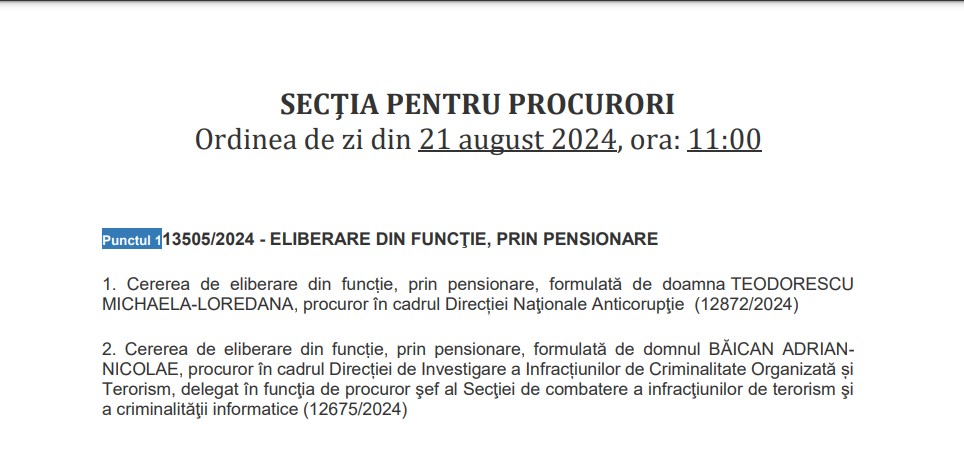 „Cererea de eliberare din funcție, prin pensionare, formulată de doamna TEODORESCU MICHAELA-LOREDANA, procuror în cadrul Direcției Naţionale Anticorupţie” se află pe ordinea de zi a ședinței CSM.