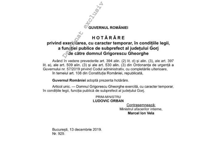 Grigorescu i-a luat locul lui Sorin Arjoca la Prefectura Gorj, fostul subprefect fiind destituit din funcție în data de 10 decembrie.