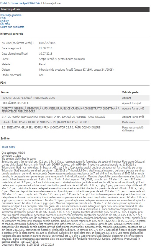 Pe data de 2 iulie 2019, instanța Curții de Apel Craiova a amânat pe data de 10 iulie pronunțarea hotărârii în cauza nr.8016/95/2015, prin care Cristea Fluerătoru a fost trimis în judecată pentru evaziune fiscală. Dosarul înregistrat cu patru ani în urmă a fost instrumentat de Parchetul de pe lângă Tribunalul Gorj. Sentința, de data aceasta, este cu executare, spun apropiați ai fostului lider sindical, magistrații din Bănie cumulând și alte pedepse cu suspendare primite de Fluerătoru. Șapte ani și jumătate cu executare este sentința primită, ieri, de salariatul CEO, care avea bagajele făcute încă din 2 iulie când se aștepta la pronunțarea sentinței în acest dosar.