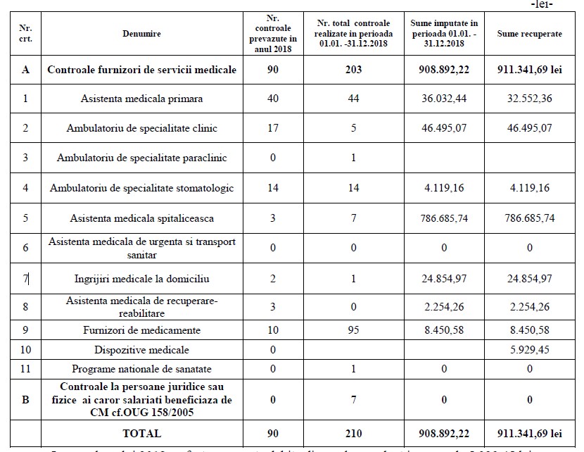 Inspectorii CJAS au verificat activitatea medicilor de familie, cea din ambulatoriile clinice şi paraclinice, activitatea medicilor stomatologi, activitatea spitalelor şi activitatea firmelor de îngrijiri la domiciliu. În total, 210 controale, dintre care 90 au fost planificate. „Urmare controalelor realizate s-au imputat servicii medicale raportate cu nerespectarea prevederilor legale în vigoare în sumă de 908.892,22 lei, care până la data de 31.12.2018 au fost recuperate în procent de 99,62% din sumele imputate. Activitățile desfășurate și raportate nu sunt în toate cazurile completate cu datele din evidențele primare, fapt ce a condus la imputarea sumelor”, se arată într-un raport semnat de directorul general al CJAS Gorj, Daniel Șurlea.