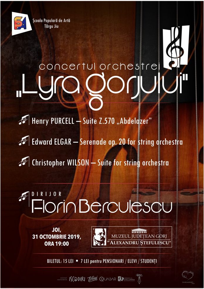 Orchestra de cameră ”Lyra Gorjului” vă invită joi, 31 octombrie 2019 la un nou concert organizat de Școala Populară de Artă Târgu Jiu și Consiliul Județean Gorj. Evenimentul se va desfășura începând cu ora 19:00, la Muzeul Județean Gorj ”Alexandru Ștefulescu”. Preţul unui bilet este de 15 lei, iar pentru elevi, studenți, pensionari este de 7 lei.