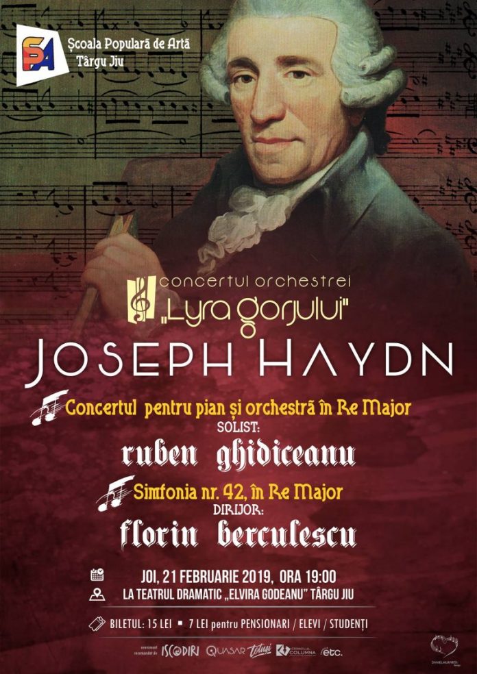 Școala Populară de Artă Târgu-Jiu și Consiliul Județean Gorj invită toți iubitorii muzicii clasice joi, 21 februarie 2019, la Teatrul Dramatic “Elvira Godeanu” din Târgu-Jiu, începând cu ora 19.00, la concertul Orchestrei de Cameră “Lyra Gorjului”. Sub bagheta dirijorului și pianistului Florin Berculescu, Orchestra de cameră va pune în valoare lucrări cunoscute ce se bucură de admiraţia iubitorilor muzicii clasice. În program vom avea parte de piese de mare popularitate din creația compozitorului Joseph Haydn – Concertul pentru pian și orchestra în Re Major, Simfonia nr.42, în Re Major. Concertul îl va avea ca solist pe pianistul Ruben Ghidiceanu. Preţul unui bilet este de 15 lei, iar pentru elevi, studenți, pensionari este de 7 lei.