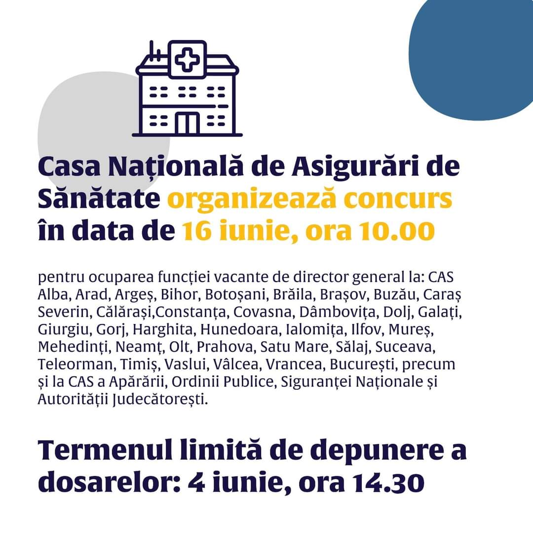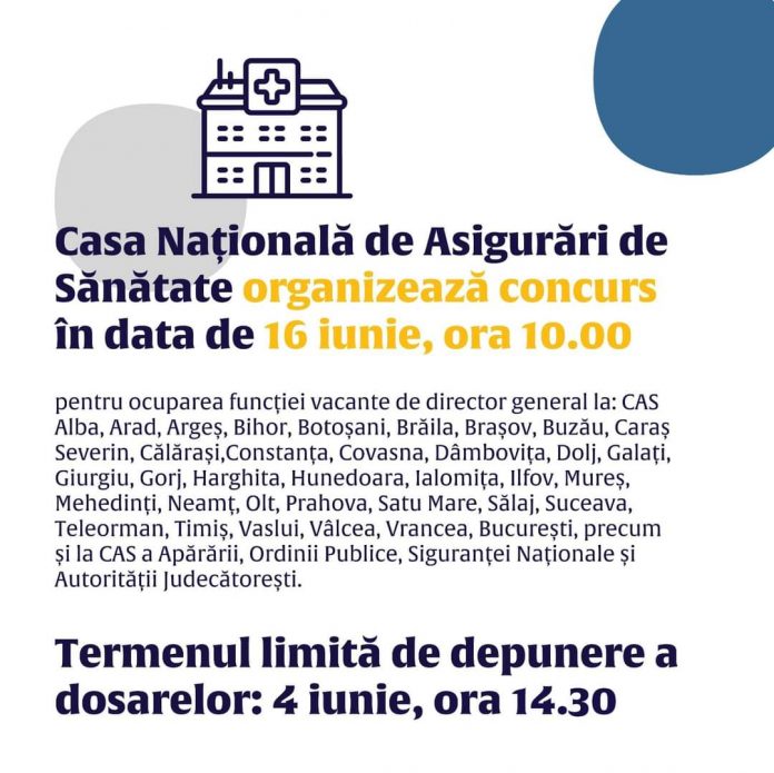 Casa Națională de Asigurări de Sănătate organizează o nouă sesiune de concurs pentru ocuparea funcțiilor vacante de director general la Casele Județene de Asigurări de Sănătate. Proba scrisă va avea loc în data de 16 iunie 2021, ora 10.00. Termenul limită de depunere a dosarelor: 04.06.2021, până la ora 14.30.